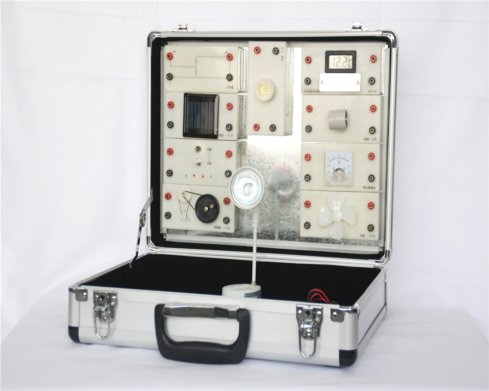 6、机械能模块:可通过摇手柄,机械转动,把机械能转换成电能,摇手柄反转,输出的电压极性相反,实现机械能直流发电。若接入电能(接入直流3V电压),使电机转动产生机械能。