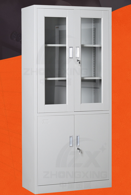 常规型、规格:1800*900*390mm 柜体主材采用厚度为0.7mm的冷轧而成,其他辅材采用厚度为0.7mm的优质冷轧钢板,高频焊接,经防锈处理,外层采用聚酯环氧粉末喷塑,颜色灰白色,焊接表面波纹均匀,保证无脱焊虚焊及焊穿等现象,焊缝打磨光滑平整无毛刺,连接牢固。上为玻璃对开门,镶装0.4mm厚钢化高强玻璃,内部2层活板;下为铁门对开门,内部2层活板;活层板下要有强力支撑,防止下垂;上下门各配置有一把锁。