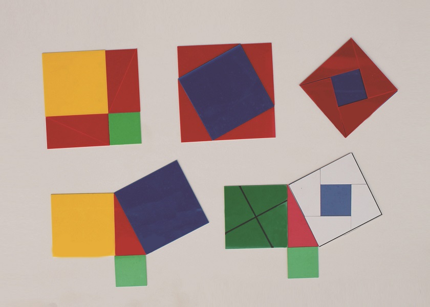 适用于小学、初中数学课堂教学学生探究实验用,利用多种图片拼图,用面积相等的方法可拼出:1、毕达哥拉斯图 2、赵爽的弦图 3、美国总统加尔菲尔德图 4、刘徽的青朱出入图 5、日本三平方原理说明图 ,让学生经历和探究勾股定理的多种推导和证明。