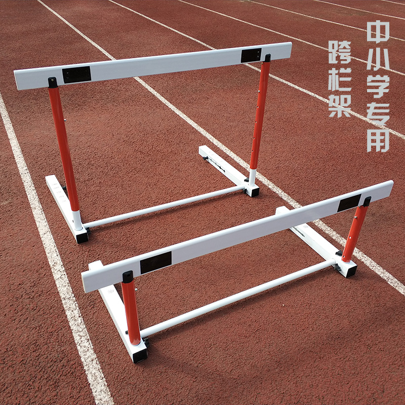 钢制可升降,范围762mm,跨栏架的总重量10KG,当篮板中段受到3.6-4KG的推力时,栏架能被推倒者即为合格。跨栏板两端固定,漆成黑白相间两色,两端为白色,条纹宽度至少为22.5cm,组成件:底管两根50×50×700mm,方形管材,壁厚3mm,底管配重铁两块,40×40×250mm,方条形铸铁制作,立柱内管两根直板一块,1200×70×20mm,为松木,中间连接各一根,直径为30×30×1000mm,方管,立柱外管为铝合金无缝管材,直径38mm,厚15mm.