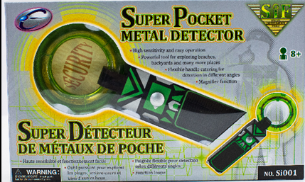 这是一款迷你金属探测器,可以探测隐藏在地下或是其他地方的金属物体,探测到金属物体后会有声音提示。中间的放大镜还可以观察物品的细节,整个产品非常小巧,非常方便外出时收纳。培养孩子探索末知世界的兴趣 (金属探测器是对肉眼看不见的金属进行感应探测的一种仪器,被广泛用于采矿和其它工业领域:用途包括排雷(探测地雷、检测武器如刀和枪(特别是运用在机场安检、地球物理探测、考古和寻找金银财宝)。