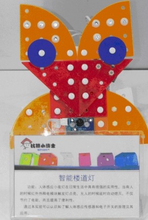 智能楼道灯对应信息技术教材,体验红外传感器的使用,当有人在人体感应模块感应区域内晃动时,LED灯点亮20s,然后熄灭;如果人一直在晃动则可能LED灯一直点亮,直到人离开20s之后LED灯熄灭。