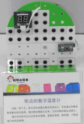 听话的数字温度计对应信息技术教材,体验声音传感器和温度传感器的使用,自由拼接组装的电子温度计,可方便显示房内或窗外的温度,只要一拍手,就会自动显示当时的温度,点亮几十秒后就会自动熄灭。