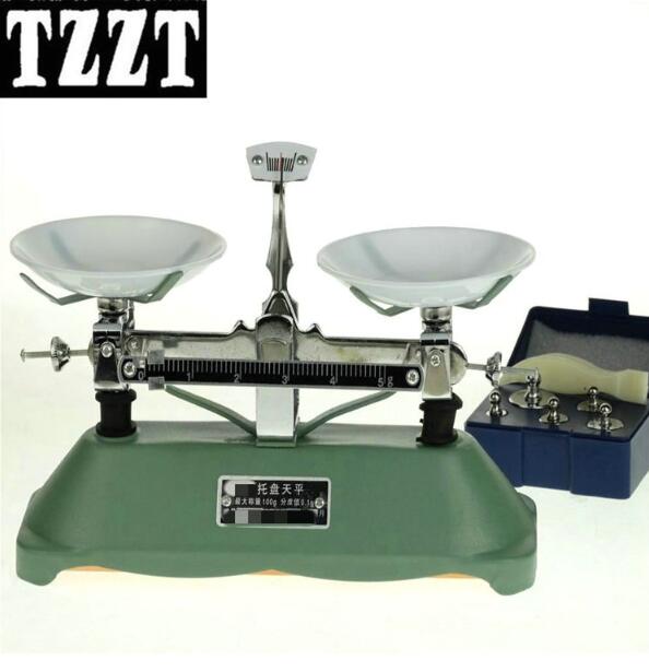 100g天平分度值:0.1g 砝码包含:5g一个,10g一个,20g两个,50g一个